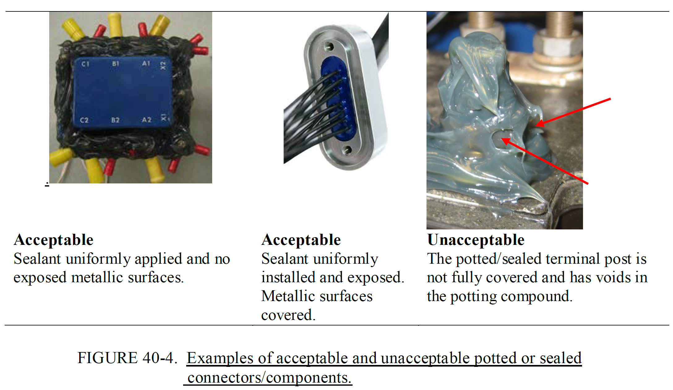 Potting compounds are a critical part of EWIS design, by providing a means to protect critical wiring terminations in environments where full exposure is inevitable. These materials, such as those identified in MIL-M-24041, are reliable potting compounds that have been part of aerospace wiring systems for decades. The compatibility of these potting compounds with wiring system components should not be assumed and must be proven acceptable. When used, the potting compounds should be considered as a solution that cannot be reworked and either requires that the connector be cut off and the harness re-terminated (assuming there is sufficient wire/cable length) or a new harness to be installed.